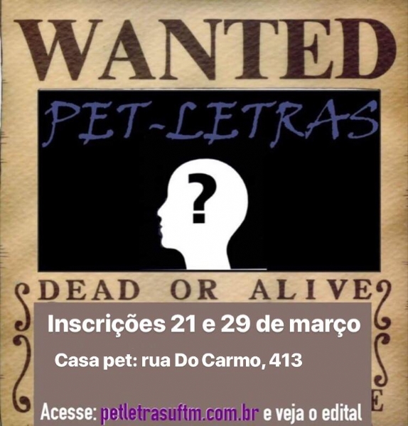 Não perca essa oportunidade e se inscreva para participar do grupo Pet-Letras. O Pet abre 5 vagas para que novos bolsistas possam fazer parte desse time. Se você é estudante de letras da UFTM e está entre o segundo e o sexto período do curso, faça sua inscrição. O link do edital: